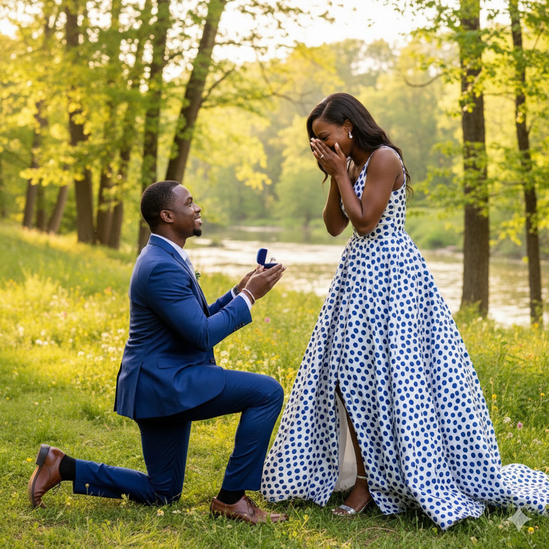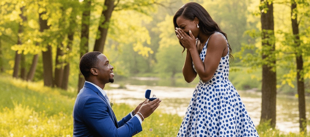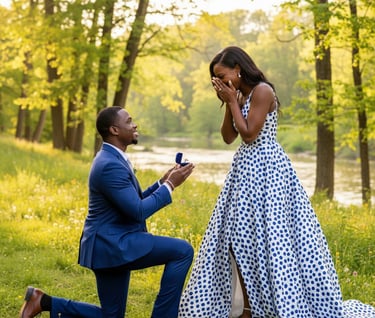 Par un après-midi ensoleillé , tandis que les feuilles se teintaient d'or et de pourpre, deux âmes s'apprêtaient à entamer un nouveau chapitre. Lyam avait méticuleusement planifié cette journée dans leur parc préféré. Aujourd'hui, il voulait la rendre inoubliable. Alors qu'ils se promenaient main dans la main, il les guida vers un banc isolé sous un arbre, sentant la magie flotter dans l'air. Une fois assis, il sentit son cœur s'emballer, la boîte en velours cachée dans sa poche pesant sur lui. Parlant de rêves, il rassembla son courage et finit par dire : « Tini, tu es tout pour moi. Je ne peux imaginer un avenir sans toi. » Agenouillé dans l'herbe, il dévoila une bague scintillante et demanda : « Veux-tu m'épouser ? » Surprise et bouleversée, Sarah hocha la tête en murmurant : « Oui ! Oui, bien sûr ! » Jason lui glissa la bague au doigt, et le parc s'anima de rires et d'applaudissements. Ils échangèrent un baiser, leur histoire d'amour prenant un tournant décisif...